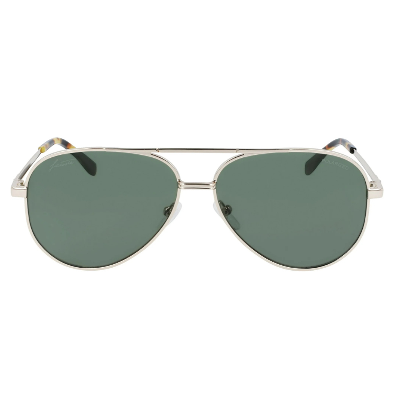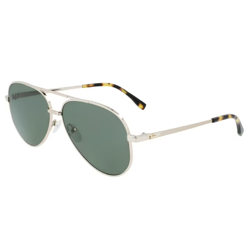 The Lacoste L233SP 714 sunglasses feature a matte green metal aviator frame with full-rim construction. Equipped with 60mm green lenses, they offer 100% UV protection and a comfortable fit with 140mm temples. The iconic crocodile logo on the temples adds a touch of signature style