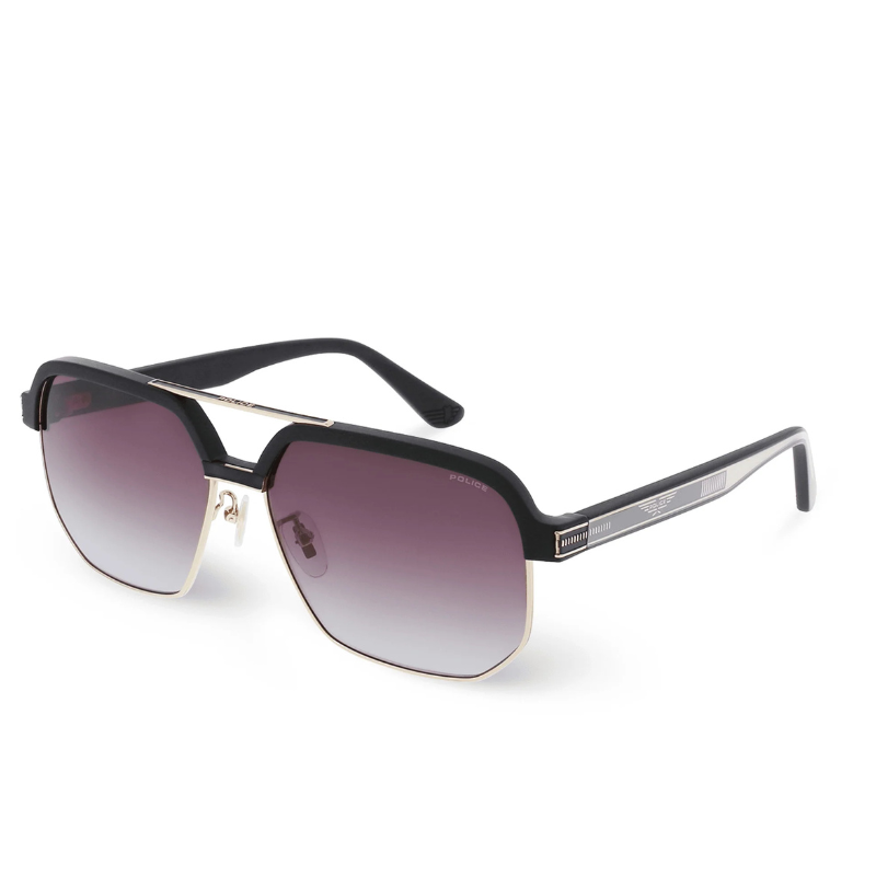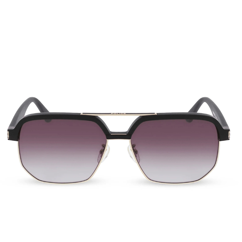 The Police Origins Hero 1 SPLF11 COL 0302 145 sunglasses feature a bold square frame in a glossy black finish, complemented by gold accents on the temples. Designed for both men and women, these sunglasses offer a chic and edgy look, suitable for various occasions.