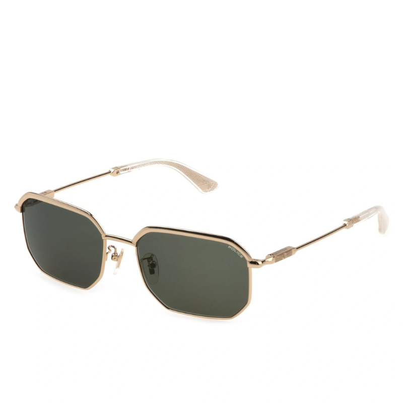 Police Horizon 2 SPLF73 0300 145 is a stylish pair of men’s sunglasses featuring a bold geometric rose gold metal frame with green lenses, designed for a modern, fashion-forward look.