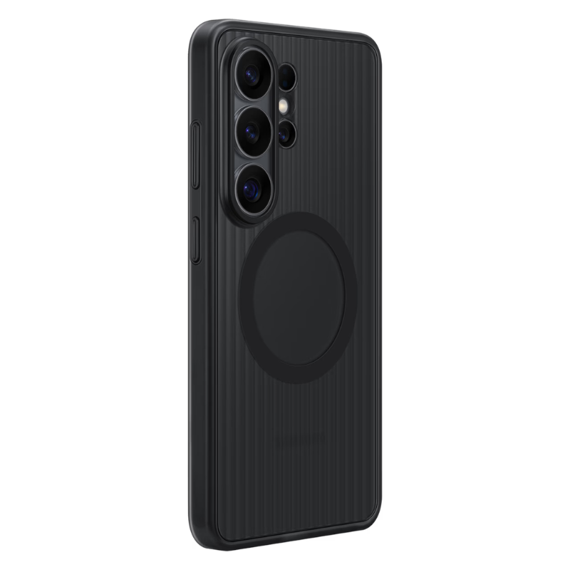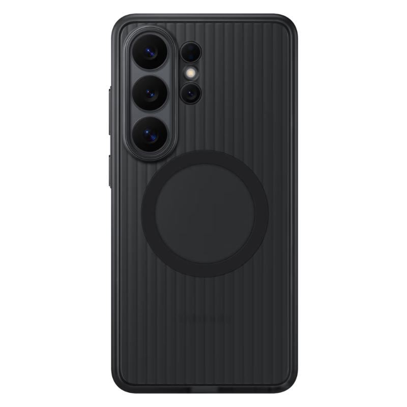 The Rugged Magnet Case absorbs shock from drops and resists scratches and impact. Tested to 5x the Military Grade Standard drop test (MIL-STD-810H), it’s built for repeated impact resistance. It passed 5 consecutive tests of 26 drops from 1.22 m, covering all faces, edges and corners for all-around protection. Raised edges protect the screen and camera, while grooved sides enhance grip. A padded inner layer adds cushioning for comfort in use. Built-in magnets help align your Galaxy S26 Ultra for fast wireless charging and allow easy attachment of compatible magnetic accessories.2