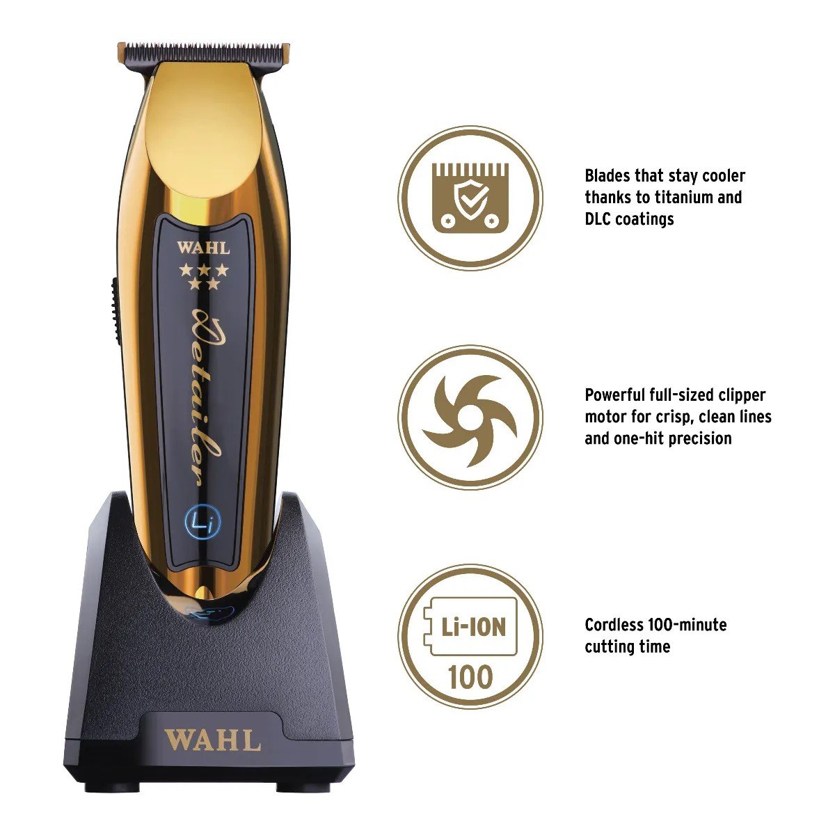 The Ultimate Cordless Trimmer! (Model 08171-700) The T-wide blade has titanium and DLC coatings so that blades stay cooler, are corrosion resistant, and are extremely strong, delivering consistently high performance. The cordless Detailer® Li Gold has an adjustable T-wide blade (#2215-700) for extremely close trimming. It operates for 100+ minutes on a full charge and comes with a weighted, space-saving, charge stand. It features a lithium-ion battery with smart LED charging. This American-made professional hair trimmer uses a powerful, full-sized clipper motor to cut smoothly through all hair types. Blades can be zero-gapped using the Pro-Set tool and is ideal for lining, trimming, and facial hair detailing and design. The cord/cordless hair trimmer measures 5.75″ in length, weighs 6.6 ounces and includes 3 trimming guides (1/16″, 1/8″, 3/16″), power cord, charge stand, pre-shave brush, cleaning brush, oil, red blade guard, pro-set tool and operating instructions. PLEASE NOTE: Due to continuous improvement, the product appearance may slightly vary from the product images on this listing. Made in USA.